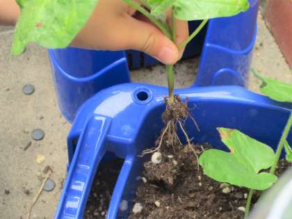 5月30日、今日は自分の鉢の中から、特にしっかり成長している2本を残す作業をしました。どの苗もみんな元気なので、抜く苗をなかなか選べない子もいました。抜いた苗はお家での栽培用として持って帰りました。
