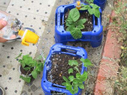 1年生が3週間前に撒いたアサガオの種が芽を出して、本葉まで出てきました。