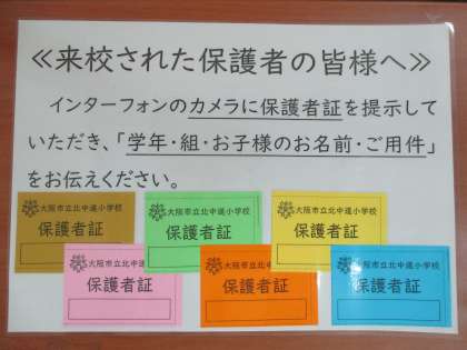 正門前のインターフォンのカメラに保護者証の名前が映るよう提示していただき、合わせて「学年・組・お子様のお名前・ご用件」をお伝えください。確認後、開錠いたします。また校内でも保護者証を児童・職員にわかるように携帯してください。