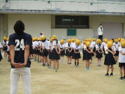 本校では児童朝会の初めに児童職員で「げんきアップストレッチ」と「げんきアップ呼吸」を行っています。