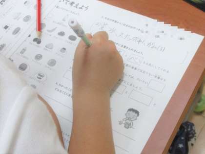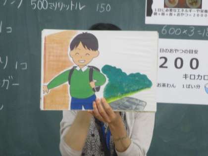 まずは自分がよく食べるおやつをワークシートから選び、どれくらいのエネルギーになるか計算してみました。その後、先生の紙芝居を観て、おやつの食べ方についてみんなで話し合いました。