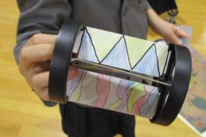 2年生は以前、生活科「あそび名人になろう」という単元でおもちゃを作りました。紙の部分には自由に模様を描いて色を塗り、自分だけの楽しいおもちゃができました。