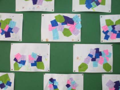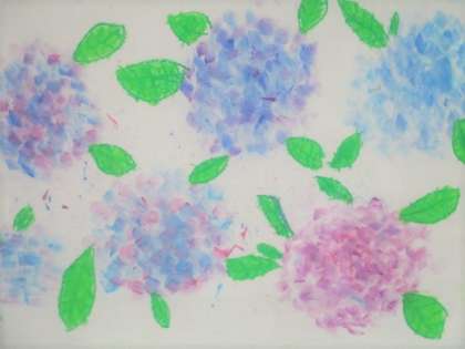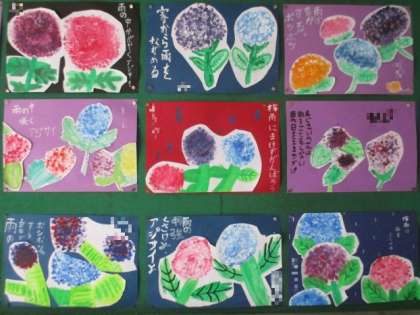 梅雨の季節、運動場で遊べない日も多いですが、校内には児童が制作したあじさいの花がいっぱいでカラフルです。