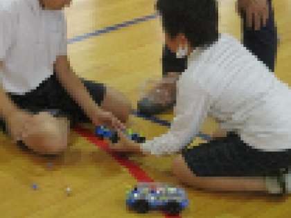 乾電池をつないだ時の電流の向きや回路のつなぎ方などについて学習しています。まとめとして電気の力で走る車を講堂で走らせました。友だちと競争したり、微調整をしたりして電流について楽しみながら学ぶことができました。