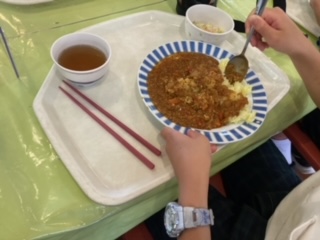 昼食はキーマカレーです。 みんなお腹ペコペコで食べるのが早いです。