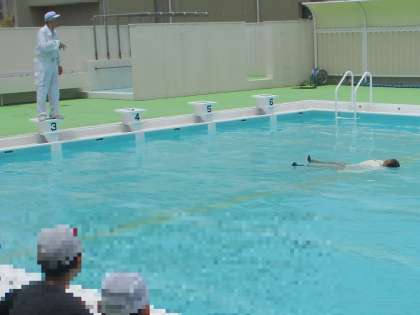 児童は普段の服装や体操服を着て、水着だけとは違う体の重さや泳ぎにくさを体験しました。