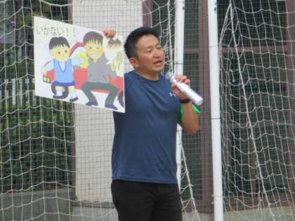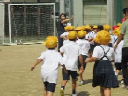 運動場に避難してから、東成警察の方からお話をしてもらい、自分の命を守るための「5つの約束」について一つずつ丁寧に教えていただきました。