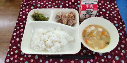 <豚肉のしょうが焼き とうふのみそ汁 じゃこピーマン ごはん 牛乳>