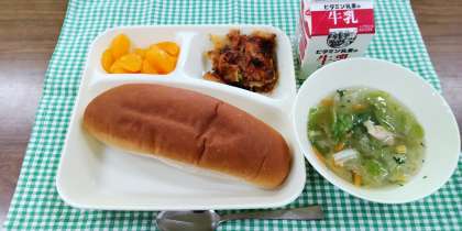 <じゃがいものミートグラタン レタスのスープ みかん(缶) 黒糖パン 牛乳>