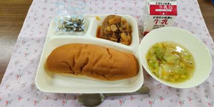 <煮こみハンバーグ 野菜スープ ミニフィッシュ 黒糖パン 牛乳>