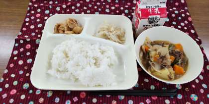 <みそ肉じゃが もやしの甘酢あえ ごまかかいため ごはん 牛乳>
