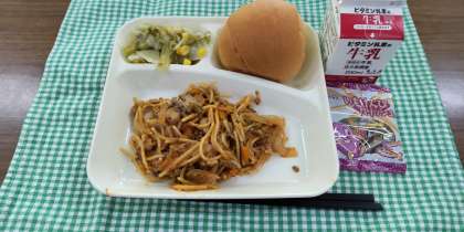 <ミートソーススパゲティ レタスとコーンのサラダ いもけんぴフィッシュ ミニコッペパン 牛乳>