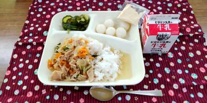 <豚丼 きゅうりの梅風味 白玉だんご きな粉 ごはん 牛乳>