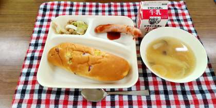<ウインナーのケチャップソース スープ 焼きツナキャベツ おさつパン 牛乳>