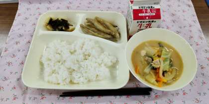 <きびなごてんぷら みそ汁 わかたけ煮 ごはん 牛乳>