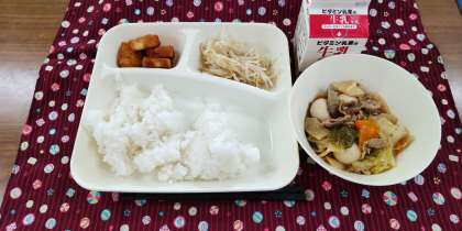<八宝菜 あつあげのピリ辛じょうゆかけ もやしの中華あえ ごはん 牛乳>