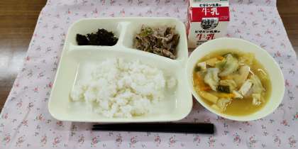 <豚肉の梅風味焼き 五目汁 のりのつくだ煮 ごはん 牛乳>
