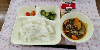 <牛肉と野菜のいため煮 きゅうりのしょうがづけ さくらんぼ ごはん 牛乳>