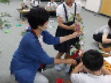 7月2日(火)、2年生が子育てサークルのみなさんと一緒に七夕の笹かざり作りを行いました。