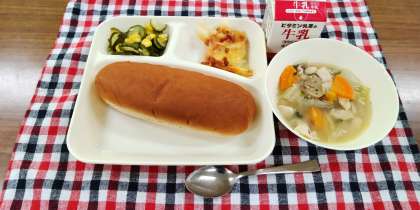 <鶏肉とてぼ豆のスープ煮 ベーコンとじゃがいものチーズ焼き きゅうりとコーンのサラダ 黒糖パン 牛乳>