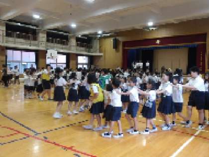 まず各班で列車を作り、音楽が止まったら先頭のリーダーがジャンケンをして列車をつないでいきます。