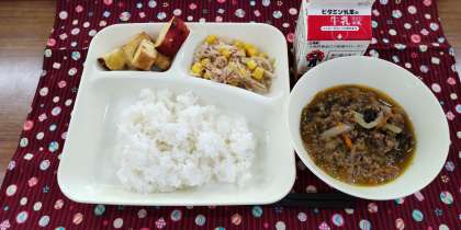 <マーボーなす ツナと野菜のいためもの 焼きさつまいもの甘みつかけ ごはん 牛乳>