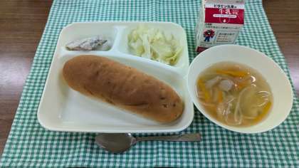 <かつおのガーリックマリネ焼き ウインナーとじゃがいものスープ キャベツのサラダ レーズンパン 牛乳>