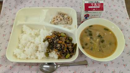<もずくと豚ひき肉のジューシー(ごはん) さつまいものみそ汁 焼きれんこん 牛乳>