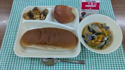 <さけのマリネ 肉だんごと押麦のスープ りんご 黒糖パン 牛乳>