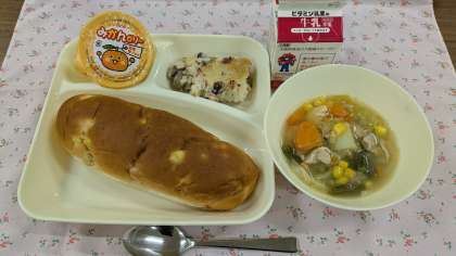 <きのこのドリア 鶏肉と野菜のスープ煮 みかんゼリー おさつパン 牛乳>