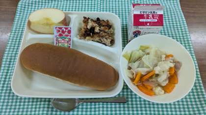 <とうふローフ ケチャップ カリフラワーのスープ煮 りんご 黒糖パン 牛乳>