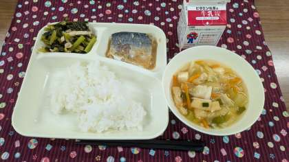 <さばのおろしじょうゆかけ 五目汁 こまつなの煮びたし ごはん 牛乳>