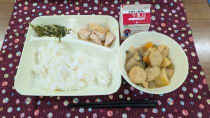 <鶏肉のおろしじょうゆかけ 一口がんもとじゃがいものみそ煮 みずなの煮びたし ごはん 牛乳>