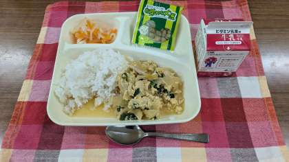 <親子丼(ごはん) 紅白なます 抹茶だいず 牛乳>