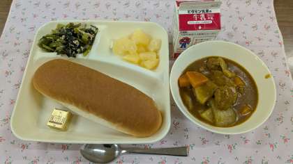 <ミートボールと野菜のカレー煮 ツナとこまつなのソテー パインアップル(カット缶) コッペパン バター 牛乳>
