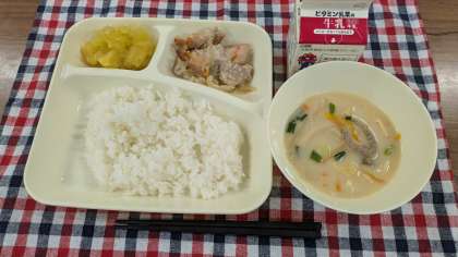 <鶏肉の塩こうじ焼き かす汁 くりきんとん ごはん 牛乳>