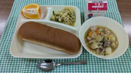 <ポトフ カレーソテー いよかん 黒糖パン 牛乳>