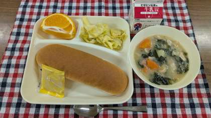 <鶏肉とほうれんそうのシチュー キャベツのサラダ デコポン コッペパン アプリコットジャム 牛乳>