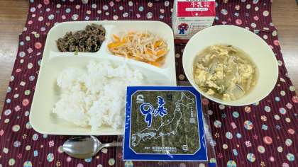 <キンパ(肉・ナムル・ごはん・焼きのり) 卵の中華スープ 牛乳>