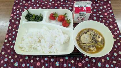 <すき焼き煮 ほうれんそうのおひたし いちご ごはん 牛乳>