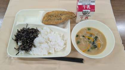 <いわしフライ みそ汁 牛ひじきそぼろ ごはん 牛乳>