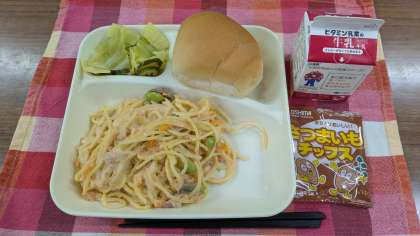 <さけのクリームスパゲッティ キャベツときゅうりのサラダ おさつチップス ミニコッペパン 牛乳>