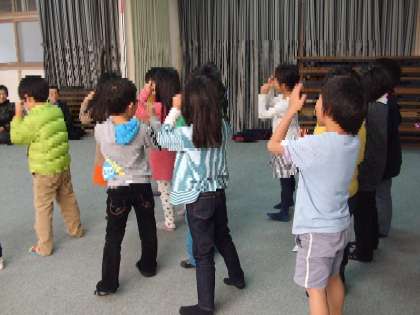 写真下)ゲストティーチャーの方にお礼の歌を歌っている様子