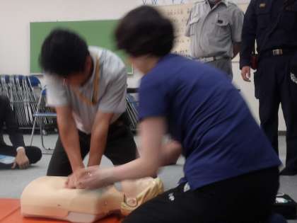 まず、DVDで実際に一次救命処置を行った一般の方の体験談を観ました。その後、AEDを使用した心肺蘇生の手順を教えていただき、職員全員が人形を使って胸骨圧迫とAEDの使い方を体験し、消防隊の方から丁寧に指導していただきました。