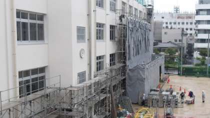運動場側の外壁工事が終了し、足場が外す作業に移りました。
