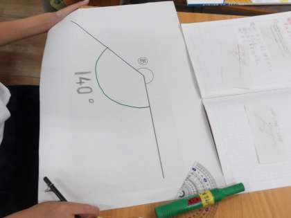 今回の研究授業は、4年「角とその大きさ」で、「180度より大きい角を工夫してはかり、その求め方を説明する。」というめあてで、ペアや全体で考えを交流し学習しました。