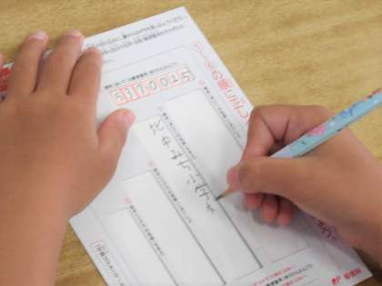 まず、あて名をはがきの真ん中に書いて、その後に住所、差出人の順番で書くことを教えてもらい、実際に担任の先生にはがきを書いて送ることになりました。