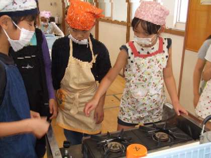 ガスの元栓を開き点火つまみをまわして、強火、中火、弱火と上手に調整でき、子ども達は「家でも、やってみたい」と声を弾ませていました。