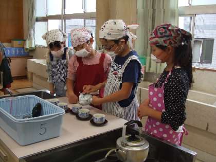 今日は、家庭科で初めての調理実習がありました。お湯を沸かして、お茶を入れるというものでしたが、子ども達は、これまでにも国際理解の学習等で調理実習を行った経験もあり、効率よく、安全に実習を行いました。
