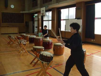 ラジオ体操やストレッチ運動をしてから、ばちの持ち方・たたく時の姿勢・腕の使い方等丁寧に教えていただきました。